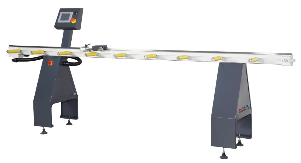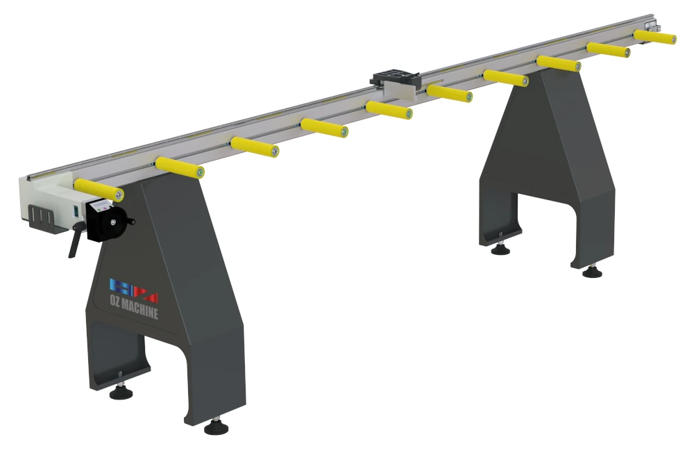 Measuring and cutting the long extrusion profiles made easy , with Ozcelik conveyor system repositioning of metal wood, plastic and aluminum made easy.