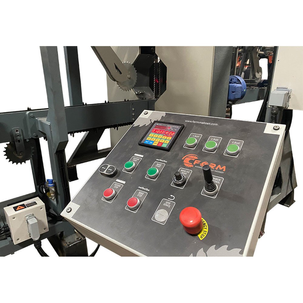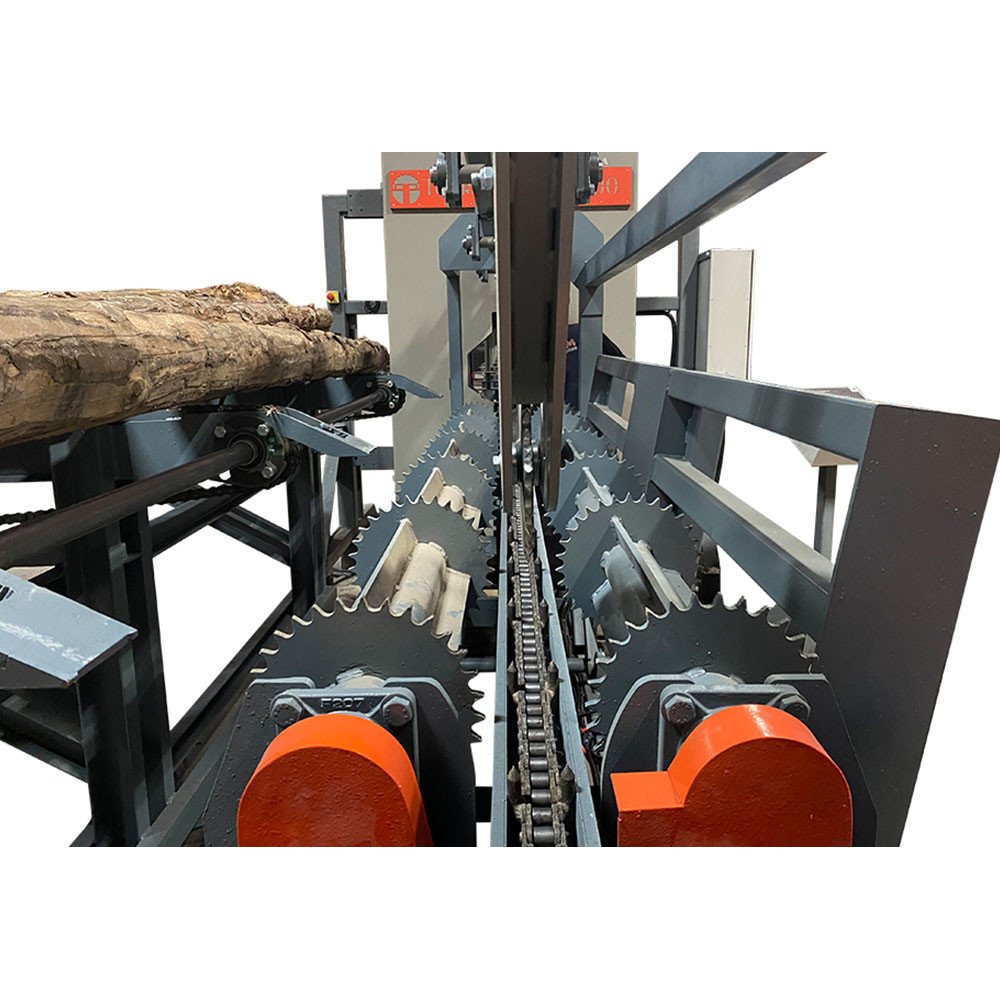 This machine is equally effective as a stand-alone resaw or as part of a fully integrated sawmill line. A movable control stand houses all essential settings, including chain feed speed, cut width, laser activation, and optional Setworks for advanced automation.